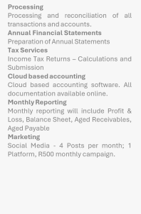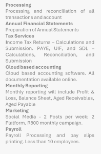 Contact form Complete the below form and submit and we will contact you regarding your requirements. Please enable JavaScript in your browser to complete this form.Please enable JavaScript in your browser to complete this form.123456Company Name *AddressAddress Line 1Address Line 2CityState / Province / RegionPostal Code--- Select country ---AfghanistanAlbaniaAlgeriaAmerican SamoaAndorraAngolaAnguillaAntarcticaAntigua and BarbudaArgentinaArmeniaArubaAustraliaAustriaAzerbaijanBahamasBahrainBangladeshBarbadosBelarusBelgiumBelizeBeninBermudaBhutanBolivia (Plurinational State of)Bonaire, Saint Eustatius and SabaBosnia and HerzegovinaBotswanaBouvet IslandBrazilBritish Indian Ocean TerritoryBrunei DarussalamBulgariaBurkina FasoBurundiCabo VerdeCambodiaCameroonCanadaCayman IslandsCentral African RepublicChadChileChinaChristmas IslandCocos (Keeling) IslandsColombiaComorosCongoCongo (Democratic Republic of the)Cook IslandsCosta RicaCroatiaCubaCuraçaoCyprusCzech RepublicCôte d'IvoireDenmarkDjiboutiDominicaDominican RepublicEcuadorEgyptEl SalvadorEquatorial GuineaEritreaEstoniaEswatini (Kingdom of)EthiopiaFalkland Islands (Malvinas)Faroe IslandsFijiFinlandFranceFrench GuianaFrench PolynesiaFrench Southern TerritoriesGabonGambiaGeorgiaGermanyGhanaGibraltarGreeceGreenlandGrenadaGuadeloupeGuamGuatemalaGuernseyGuineaGuinea-BissauGuyanaHaitiHeard Island and McDonald IslandsHondurasHong KongHungaryIcelandIndiaIndonesiaIran (Islamic Republic of)IraqIreland (Republic of)Isle of ManIsraelItalyJamaicaJapanJerseyJordanKazakhstanKenyaKiribatiKorea (Democratic People's Republic of)Korea (Republic of)KosovoKuwaitKyrgyzstanLao People's Democratic RepublicLatviaLebanonLesothoLiberiaLibyaLiechtensteinLithuaniaLuxembourgMacaoMadagascarMalawiMalaysiaMaldivesMaliMaltaMarshall IslandsMartiniqueMauritaniaMauritiusMayotteMexicoMicronesia (Federated States of)Moldova (Republic of)MonacoMongoliaMontenegroMontserratMoroccoMozambiqueMyanmarNamibiaNauruNepalNetherlandsNew CaledoniaNew ZealandNicaraguaNigerNigeriaNiueNorfolk IslandNorth Macedonia (Republic of)Northern Mariana IslandsNorwayOmanPakistanPalauPalestine (State of)PanamaPapua New GuineaParaguayPeruPhilippinesPitcairnPolandPortugalPuerto RicoQatarRomaniaRussian FederationRwandaRéunionSaint BarthélemySaint Helena, Ascension and Tristan da CunhaSaint Kitts and NevisSaint LuciaSaint Martin (French part)Saint Pierre and MiquelonSaint Vincent and the GrenadinesSamoaSan MarinoSao Tome and PrincipeSaudi ArabiaSenegalSerbiaSeychellesSierra LeoneSingaporeSint Maarten (Dutch part)SlovakiaSloveniaSolomon IslandsSomaliaSouth AfricaSouth Georgia and the South Sandwich IslandsSouth SudanSpainSri LankaSudanSurinameSvalbard and Jan MayenSwedenSwitzerlandSyrian Arab RepublicTaiwan, Republic of ChinaTajikistanTanzania (United Republic of)ThailandTimor-LesteTogoTokelauTongaTrinidad and TobagoTunisiaTurkmenistanTurks and Caicos IslandsTuvaluTürkiyeUgandaUkraineUnited Arab EmiratesUnited Kingdom of Great Britain and Northern IrelandUnited States Minor Outlying IslandsUnited States of AmericaUruguayUzbekistanVanuatuVatican City StateVenezuela (Bolivarian Republic of)VietnamVirgin Islands (British)Virgin Islands (U.S.)Wallis and FutunaWestern SaharaYemenZambiaZimbabweÅland IslandsCountryPhoneEmail *Company Registration NumberType of Company *Pty LtdCCSole ProprietyOtherNextPRIMARY CONTACT DETAILS Owner Name and Surname *FirstLastOwner Tel nrOwner Email *Contact Name and Surname *FirstLastContact Tel nrContact Email *NextADDITIONAL INFORMATION Type of Industry *ServicesRetailManufacturingOtherSize of Company *Very smallSmallMediumVery Small 0-4 Employees, <R1,000,000 Annual Turnover Small 5-14 Employees, <R5,000,000 Annual Turnover Medium 15-35 Employees, <R10,000,000 Annual Turnover Financials are up to date? *YesNoNextONCE-OFF PACKAGES Which, if any, of the packages would you like us to quote you on? *Basic PackageEnhanced PackagePremium PackageBasic Package Enhanced Package Premium Package NextMONTHLY PACKAGES Which, if any, of the packages would you like us to quote you on? (copy) *Basic PackageEnhanced PackagePremium PackageBasic monthly package Enhanced monthly package Premium monthly package (copy) Email vendor NextADDITIONAL If our packages is not what you are looking for - please select one or more of the following services, in order for us to provide you with an accurate quotation.Logo DesignWebsite DesignLabel DesignBusiness RegistrationReconciliationData AnalysisForm CreationPayroll Services (monthly)Marketing Services (monthly)Accounting Services (monthly)Converstion Accounting SoftwareBriefly explain what you company doesAccounting Software you currently use:Payroll Software you currently use:Number of debit/check transactions you have monthlyDo you currently have vendor (supplier) accounts?YesNoApproximately how many invoices do you generate monthly?Please select the ones that is appropriate to you:Tracking InventoryCharge VAT on invoicesNumber of bank accounts:Number of credit cards:Have you worked with a consulting/bookkeeping/markeing agency before?YesNoIf yes - provide details:What social media accounts do you have in place?Facebook pageInstagramBusiness WebsiteWho is your target market?Please provide additional information/notes on services your require:By submitting this form, I agree to provide accurate information to the best of my knowledge. I understand that this information will be used for accounting/consulting/marketing purposes. I authorize Newdusk Pty Ltd to contact me using the information provided. Submit